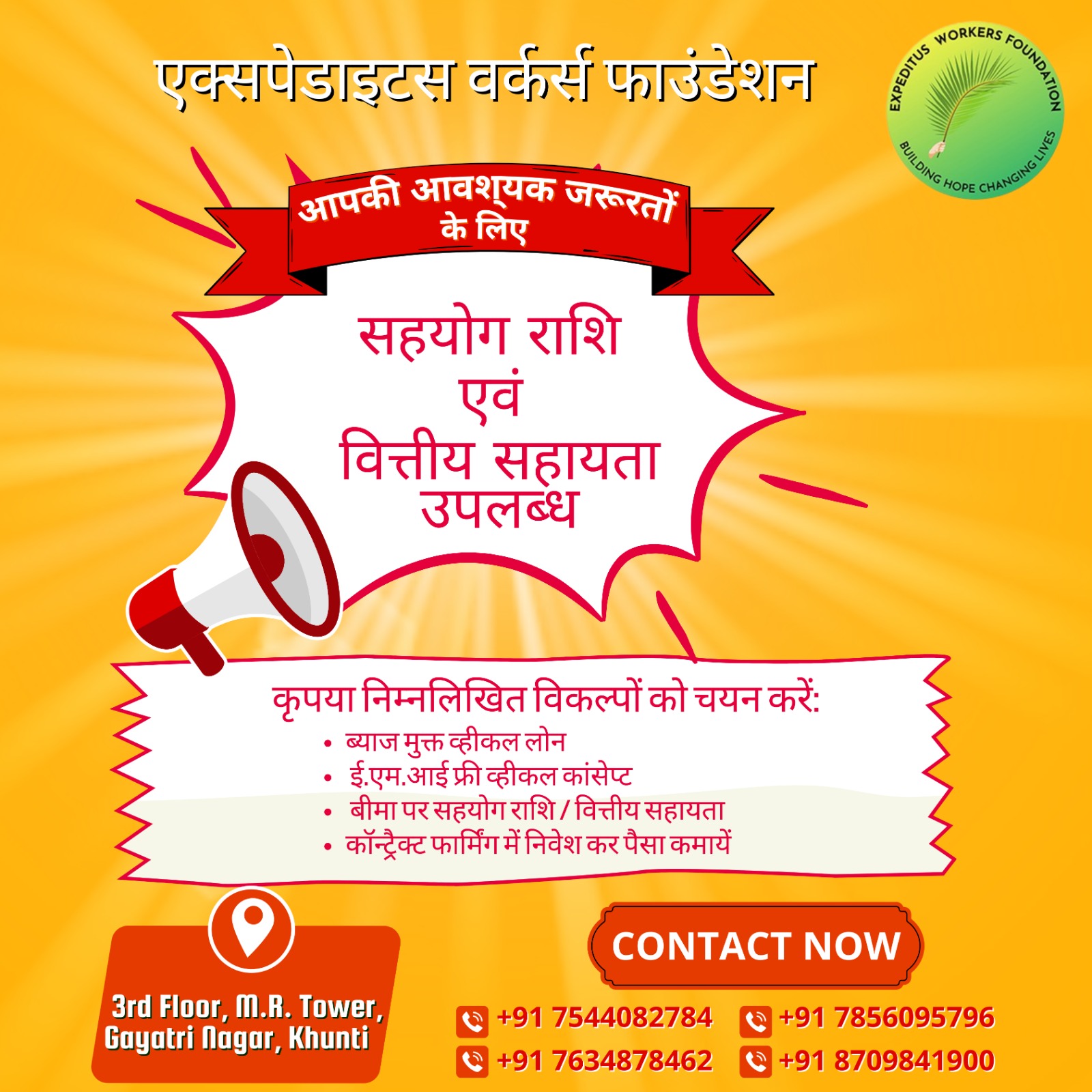 Hello! Welcome to the Expeditus Workers Foundation. We are here to provide Support Fund and Financial Assistance to meet your essential needs. Please let us know what kind of assistance you need and how we can help you. Our aim is to help you improve your life.